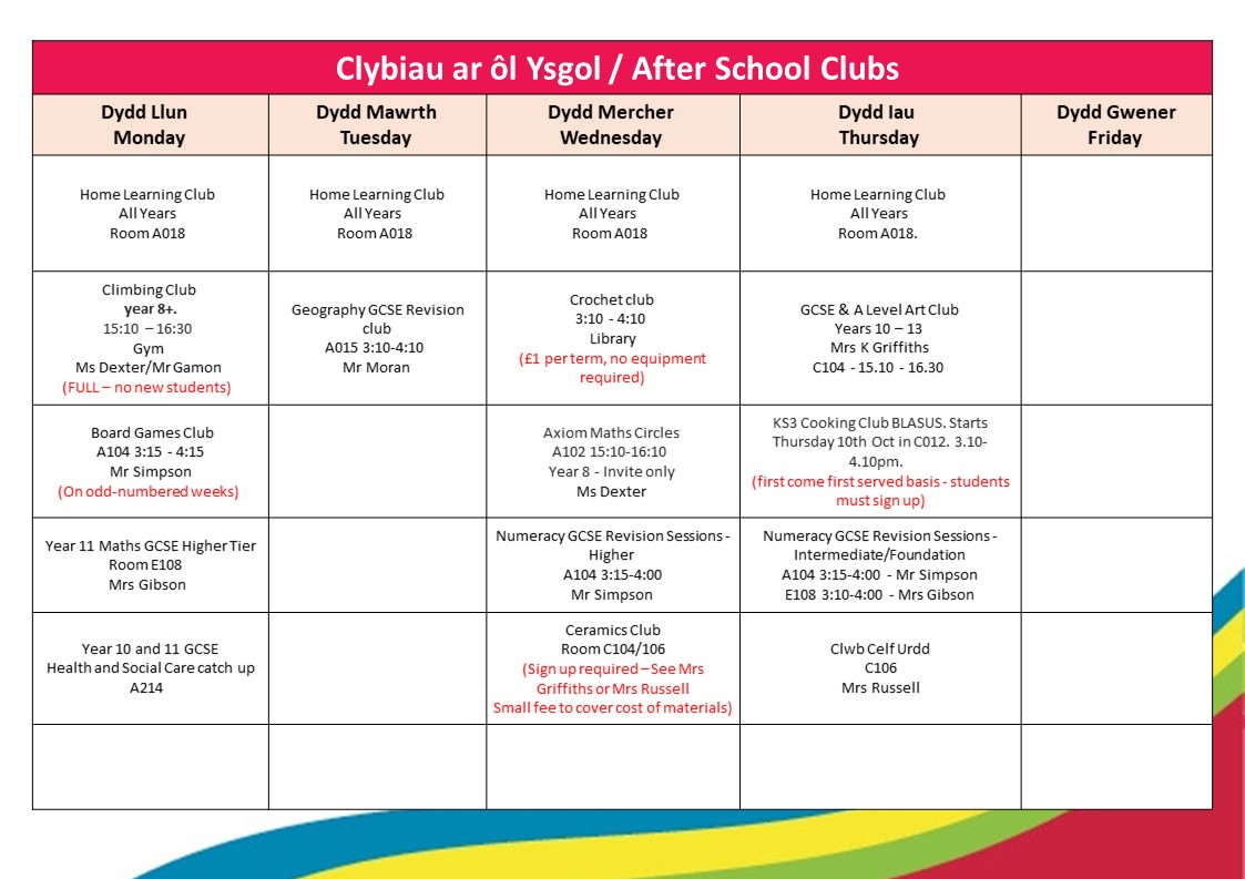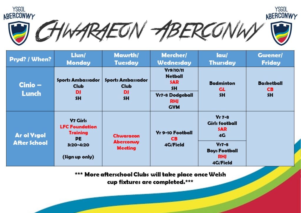 We work closely with Actif Conwy to provide a wide range of extra-curricular activities and using the support of Actif Conwy, utilise the extremely successful Young Ambassador programme. This programme empowers student representatives for extracurricular sport in school to utilise the student voice, in the creation of the extra-curricular programme to provide extra enrichment outside of curriculum time, where there is a focus on participation and being active – based on what the students want delivered.